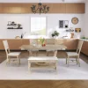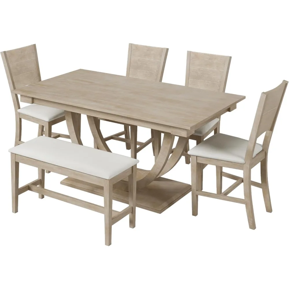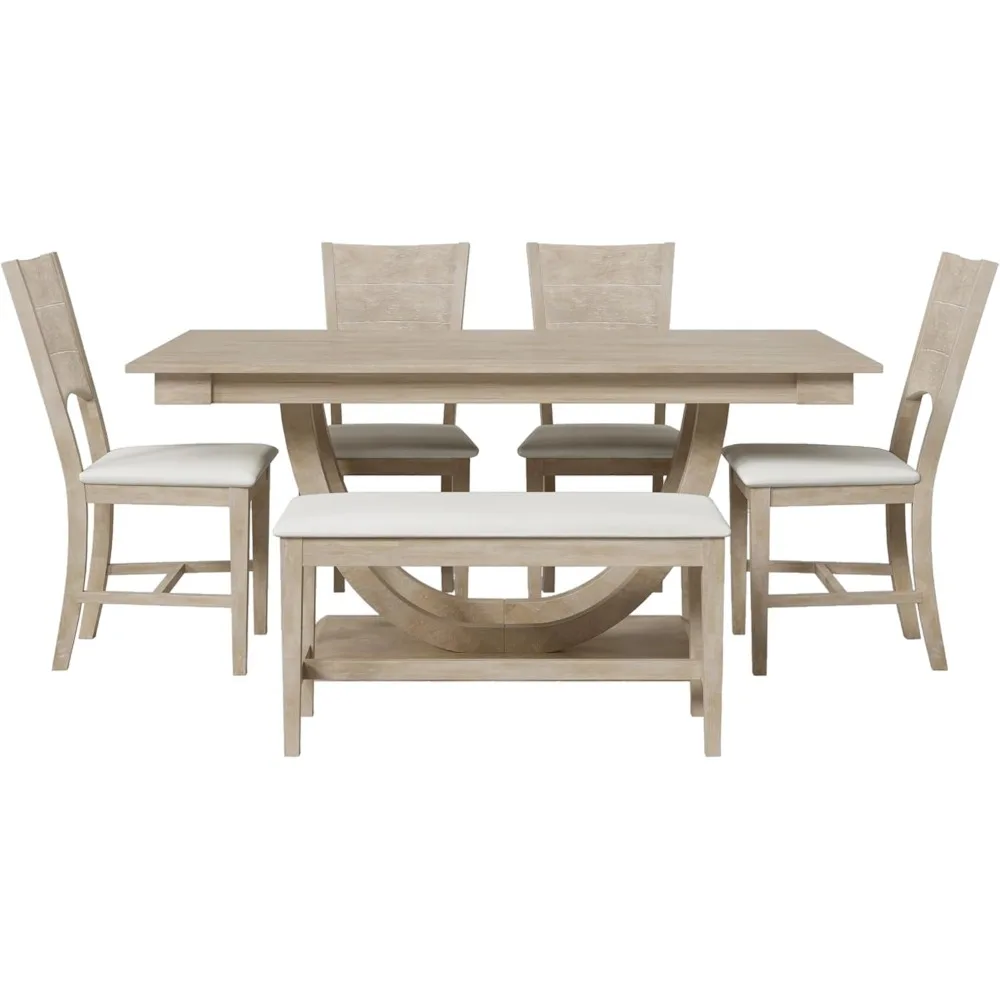 - 【Modern Dining Set for 6】 Experience a harmonious blend of modern and traditional design with our 6-piece solid wood dining set. This collection comprises a rectangular table, four chairs, and a bench, all uniquely distinguished by half-round table legs. Each chair and bench seat is lavishly padded, offering both comfort and style. Ideal for accommodating up to six, this set elevates your dining space, making a statement in any interior.