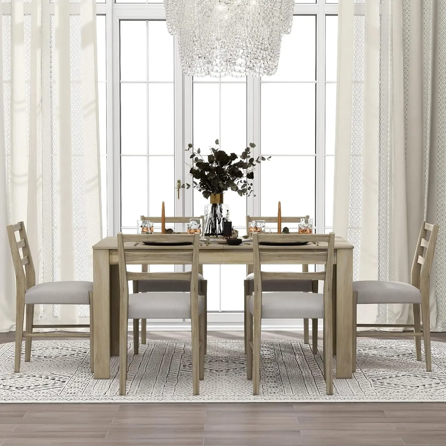 7 Pieces Wooden Dining Table Set Rectangle Extendable Table with 12” Leaf and 2 Drawers, 6 Dining Chairs with Soft Cushion