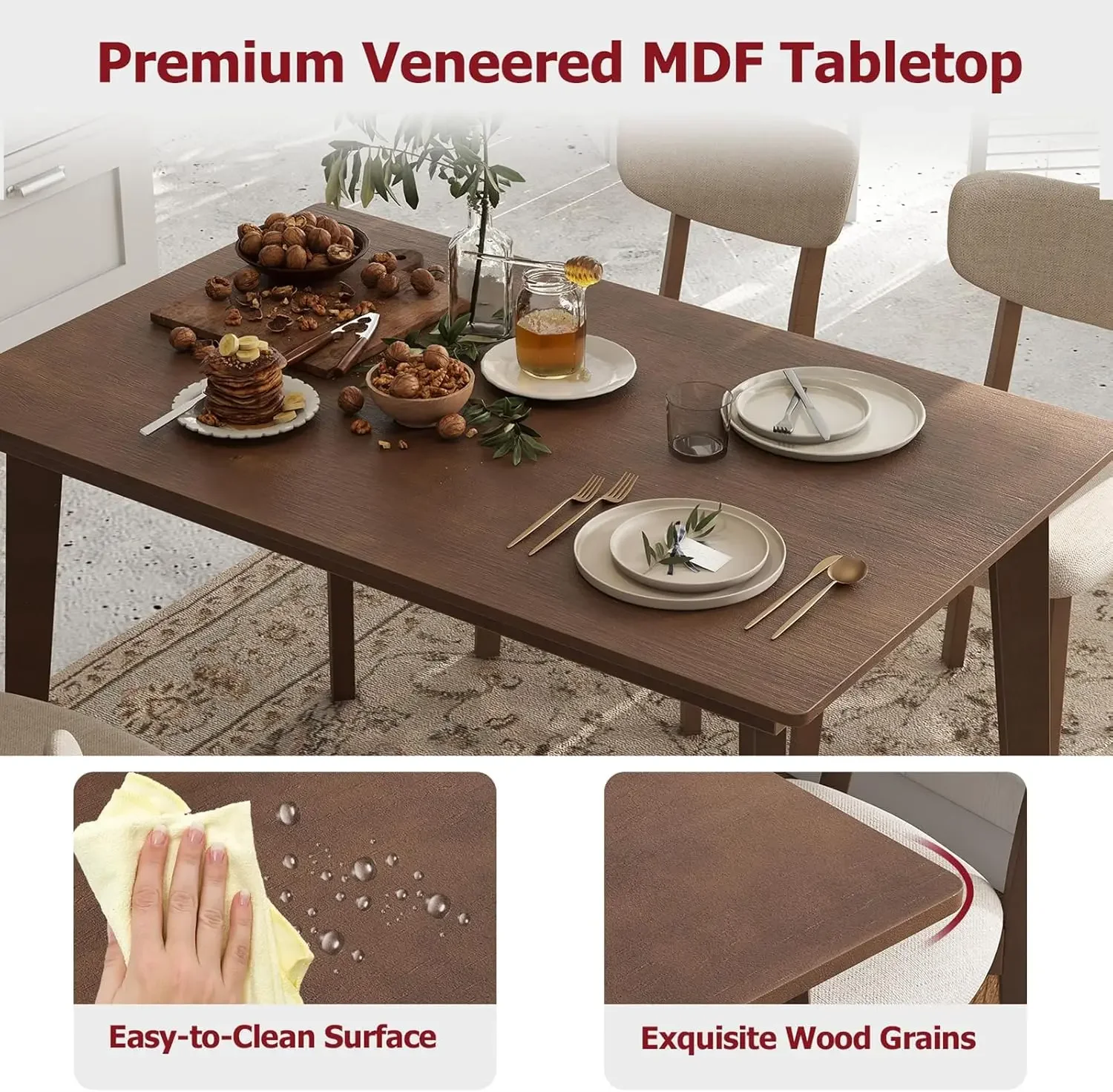 - SPACE SAVING DESIGN: When not in use, the 4 chairs can be neatly tucked under the table, maximizing the efficiency of your dining area and promoting a clean living environment. This versatile wooden dining set is suitable for a range of spaces, including the living room, dining room, or restaurant.