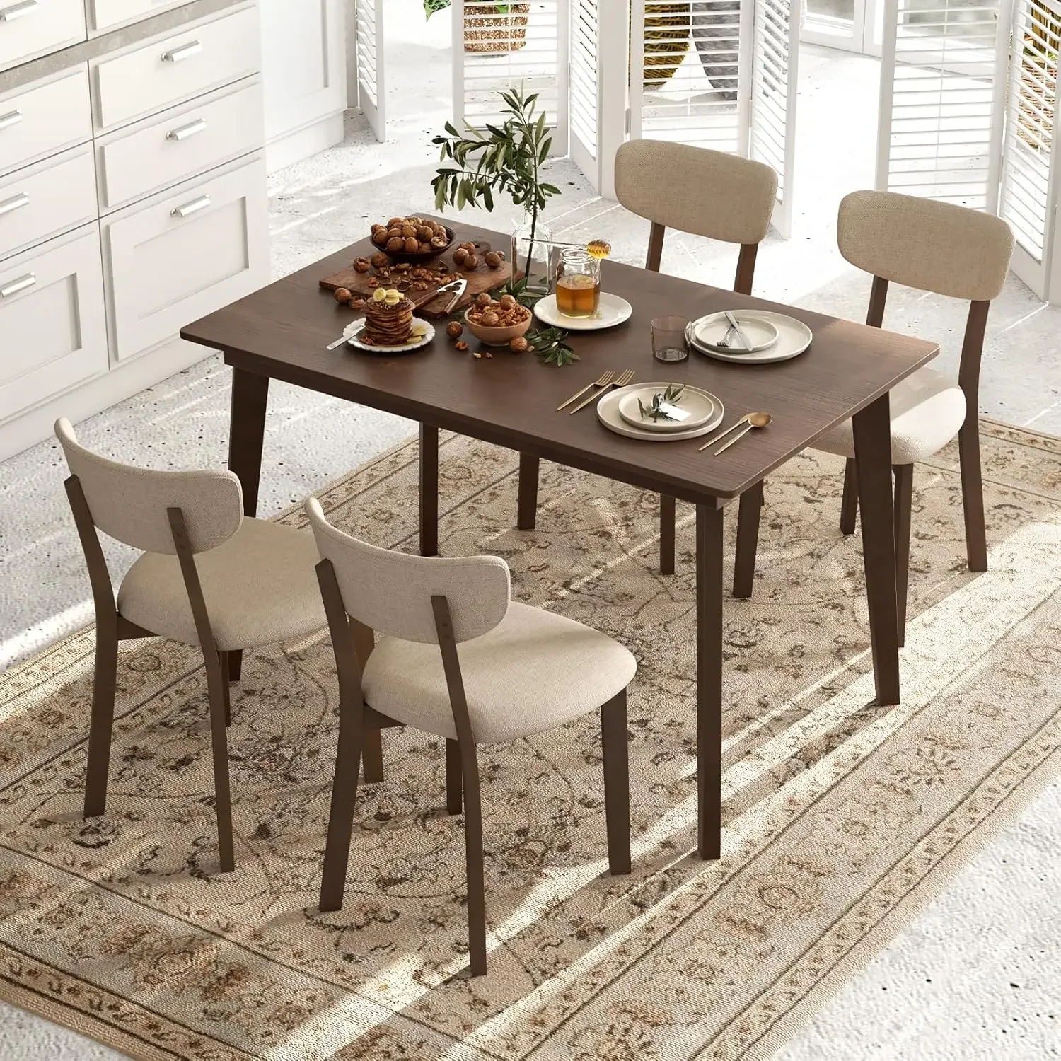 - MID-CENTURY DINING TABLE SET: This 5-piece dining set includes a generously sized rectangular dining table and four cushioned chairs, perfect for family meals or informal get-togethers. The table and chairs have sturdy legs crafted from high-quality rubber wood, providing reliable support for long-lasting use.